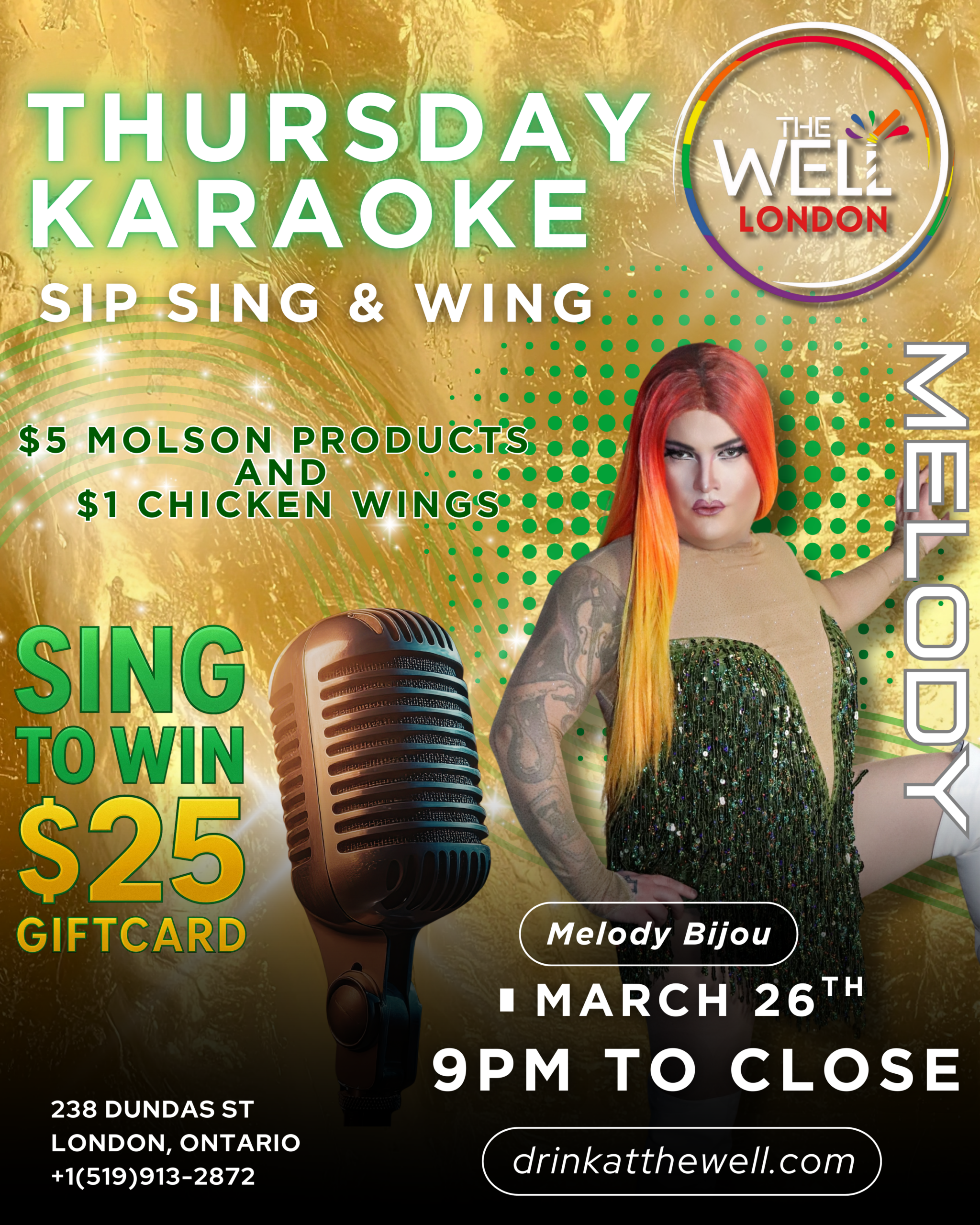 Highlight: Karaoke hosted by Melody Bijou. Sing to win a $25 Gift Card!